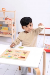 Każdy element ma praktyczny uchwyt, dzięki któremu dzieci wygodnie trenują małą motorykę, precyzję ruchów oraz samodzielność podczas układania.