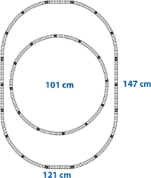 System torów pozwala na stworzenie dwóch obwodów: wewnętrznego o wymiarach 101 cm oraz zewnętrznego 147 cm.