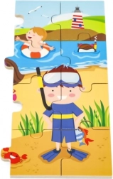 Kolorowa scena z plaży zachęca do układania i otwiera przestrzeń do rozmów o lecie, wodzie oraz bezpiecznym zachowaniu na zewnątrz. Dzieci przy tym poszerzają słownictwo i wyobraźnię.