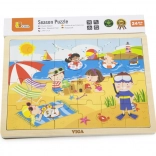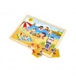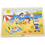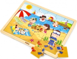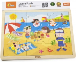 VIGA drewniane puzzle lato – 24 elementy to idealna pierwsza układanka dla dzieci od 2 lat. Solidne drewniane elementy i ramka pomagają utrzymać motyw na miejscu, dzięki czemu dzieci mogą skupić się na układaniu i cieszyć się efektem. Wesoła letnia ilustracja z plaży naturalnie rozwija słownictwo i wyobraźnię.