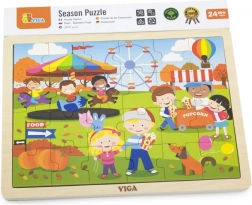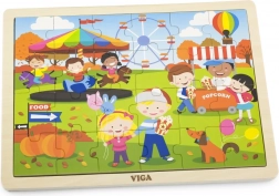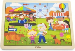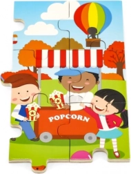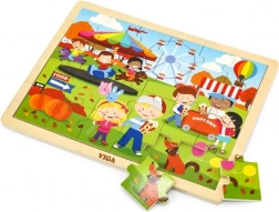 Odkryj wysokiej jakości drewniane puzzle dla dzieci z wesołą sceną jesiennego jarmarku. Dzięki 24 solidnym elementom i ramce świetnie nadają się także dla młodszych dzieci, które podczas zabawy naturalnie ćwiczą koordynację ręka–oko oraz postrzeganie kształtów i kolorów.
