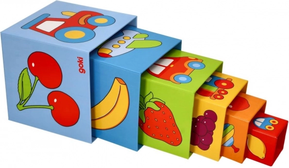 Wieża do układania z klocków GOKI to świetny pierwszy zestaw konstrukcyjny dla najmłodszych. Dzieci mogą układać klocki jeden na drugim, wkładać je jeden w drugi i odkrywać urocze ilustracje owoców, pojazdów, zabawek i zwierzątek. Dzięki solidnemu kartonowi klocki wytrzymują codzienną zabawę, a jednocześnie są lekkie i bezpieczne dla małych rączek.