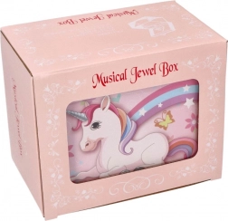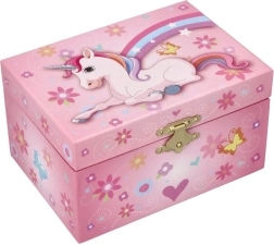 Szkatułka w stylu pozytywki ucieszy każdą małą damę. W środku znajduje się lusterko i urocza figurka jednorożca, która po otwarciu wieczka zaczyna się obracać w rytm melodii Jezioro łabędzie. Wnętrze jest wyłożone miękką tkaniną, aby łańcuszki, bransoletki czy pierścionki były bezpiecznie przechowywane.