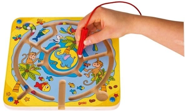 Ten magnetyczny labirynt został zaprojektowany, aby inspirować dzieci do zabawy i nauki. Dzięki drewnianemu wykonaniu i solidnej konstrukcji zabawka jest wytrzymała i trwała. Dzieci mogą przemieszczać kolorowe kulki na dwa sposoby - tradycyjnie magnetycznym patykiem lub dzieląc kulki według kolorów do różnych celów.
