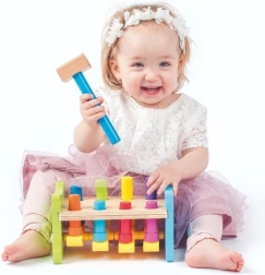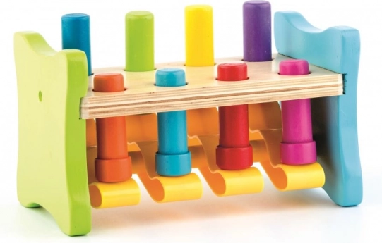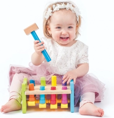Ta nowoczesna wersja klasycznej drewnianej zabawki do wbijania marki WOODY przynosi dzieciom radość z odkrywania i nauki. Kołki są połączone plastikową kołyską, dzięki czemu każdy cios młotkiem daje natychmiastowy i widoczny efekt – jeden kołek chowa się, a drugi wyskakuje do góry. Dzieci w zabawny sposób ćwiczą siłę chwytu, precyzję i cierpliwość.