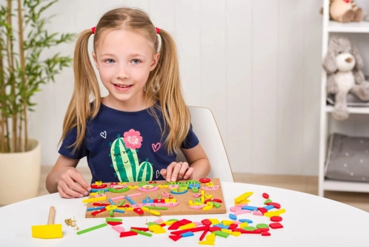 Korkowa tablica tłumi uderzenia, drewniane elementy są gładko wykończone, a gwoździki łatwo się wbijają – idealne dla małych początkujących twórczyń.