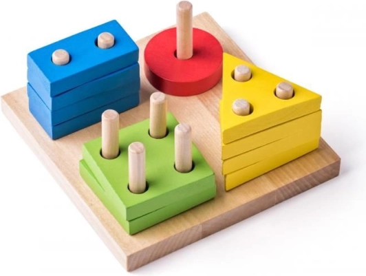 Kolorowa drewniana układanka rozwija dziecięcą motorykę małą, koordynację ręka–oko oraz umiejętność rozróżniania kolorów i kształtów. Na solidnej drewnianej podstawie znajdują się kołki, na które dzieci nakładają koła, prostokąty, trójkąty i kwadraty zgodnie z liczbą otworów.