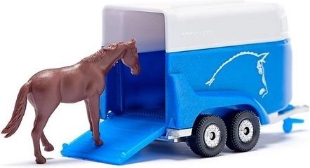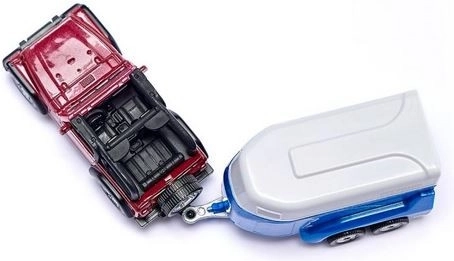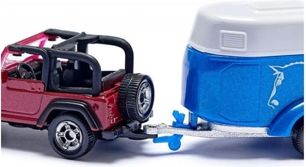 Pojazd typu Jeep ze specjalną przyczepą do transportu koni, wykonany z wysokiej jakości metalowych i plastikowych elementów.