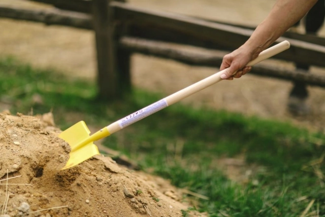 Gładki drewniany trzonek doskonale leży w dziecięcej dłoni i ułatwia bezpieczną obsługę podczas prac w ogrodzie.