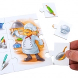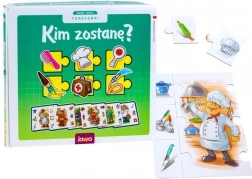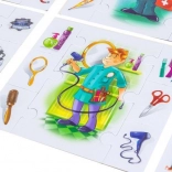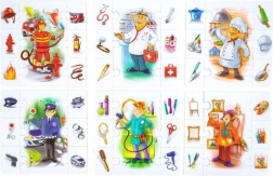 Ten angażujący zestaw zawiera 6 ilustrowanych plansz z zawodami (policjant, malarz, fryzjer, lekarz, kucharz, strażak) oraz 36 elementów z przedmiotami do nich pasującymi. Zadaniem dzieci jest prawidłowe dopasowanie rekwizytów do danego zawodu i układanie tematycznych scenek. Zestaw wspiera rozumienie zależności, pamięć i rozwój języka.