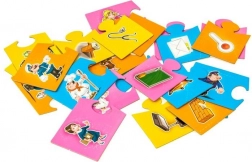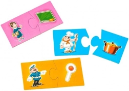 Odkryj świat pracy w zabawny sposób. Dzieci dopasowują kolorowe elementy z obrazkami zawodów do elementów z przedmiotami, które do nich pasują – na przykład kucharza do garnka lub policjanta do znaku drogowego. Gra naturalnie rozwija słownictwo i zrozumienie tego, czym zajmują się różni ludzie.