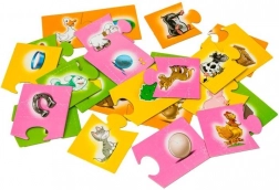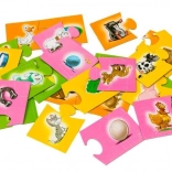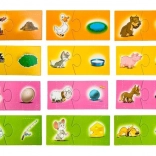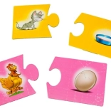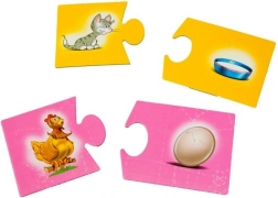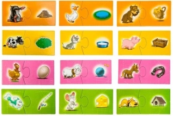 Dzieci dopasowują zwierzęta do odpowiednich przedmiotów (np. kot – miska, kura – jajko). Ćwiczą logiczne rozumowanie i naturalnie poszerzają słownictwo.