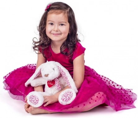 Uszka, łapki i kokardka z subtelnym różowym kwiatowym wzorem nadają zabawce czarujący wygląd, który pokochają dzieci i rodzice.