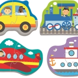 Dziecięca układanka z motywami transportu dla najmłodszych łączy zabawę i naukę. Zawiera cztery dwuelementowe puzzle z łodzią, samolotem, samochodem i pociągiem, które pomagają rozwijać motorykę i umiejętności rozwiązywania problemów u dzieci.