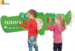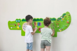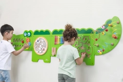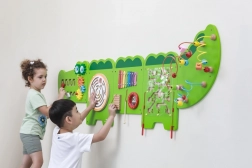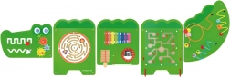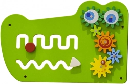 Ścienna tablica Krokodyl podzielona na pięć części oferuje dzieciom różne aktywności: część głowowa z labiryntami i przekładniami kół zębatych, okrągły labirynt z kuleczką, panel muzyczny z kolorowym ksylofonem i powierzchnią grzechoczącą, magnetyczny labirynt z dwiema magnetycznymi rysikami oraz ogon z trzema 3D koralikowymi torami. Każda sekcja wspiera inną umiejętność i motywuje dzieci do odkrywania.