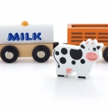 Zestaw zawiera lokomotywę i trzy wagony – cysternę oznaczoną MILK, wagon bydlęcy z krówką oraz wagon towarowy. Gładkie krawędzie i trwałe wykonanie są idealne do pokoju dziecięcego i do przedszkoli.