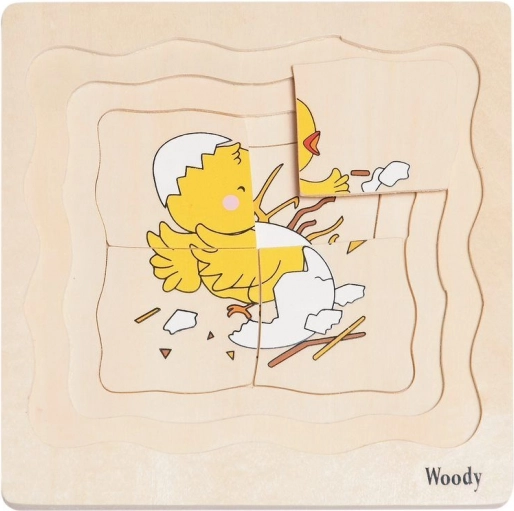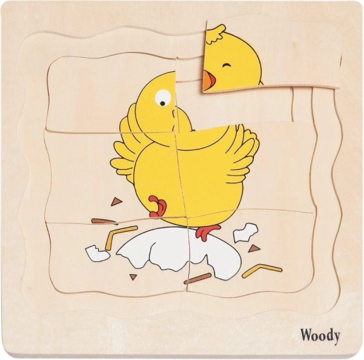 Poszczególne warstwy pokazują rozwój od jajka do kurczątka. Dzieci uczą się sekwencji krok po kroku w zabawny sposób.