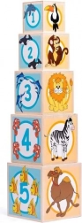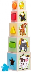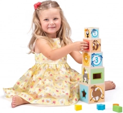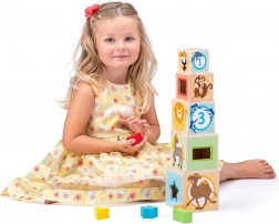 Drewniana wieża z kubeczkami i sorterem kształtów łączy układanie w wysokość z ćwiczeniem wkładania właściwych kształtów w odpowiednie otwory. Dzieci rozwijają koordynację ręka–oko, uczą się kolorów, liczb i zwierzątek, a przy tym mają mnóstwo kreatywnej zabawy.