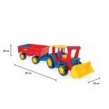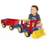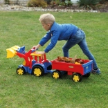 Ogromny dziecięcy traktor z przyczepą marki Wader zachwyci małych budowniczych: ma długość 117 cm, ruchomą przednią łyżkę, otwieraną tylną klapę przyczepy oraz wyjątkową nośność do 100/60 kg. Wykonany z bezpiecznego, wytrzymałego plastiku, nadaje się do zabawy w domu i na zewnątrz, wspierając motorykę i wyobraźnię.