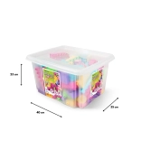 Przezroczysty plastikowy pojemnik z zatrzaskową pokrywą utrzymuje klocki razem, ułatwia porządkowanie i pozwala mieć wgląd w zawartość.