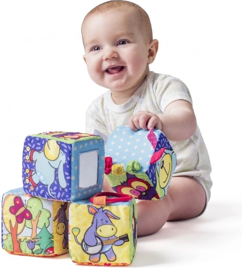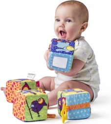 Mięciutkie tekstylne klocki NINY przynoszą zabawę i rozwój zmysłów już od urodzenia. Zawierają grzechotki, piszczałki, gryzaki, lusterko z folii bezpieczeństwa oraz elementy z szeleszczącego papieru, które wspierają małą motorykę i percepcję sensoryczną dziecka.