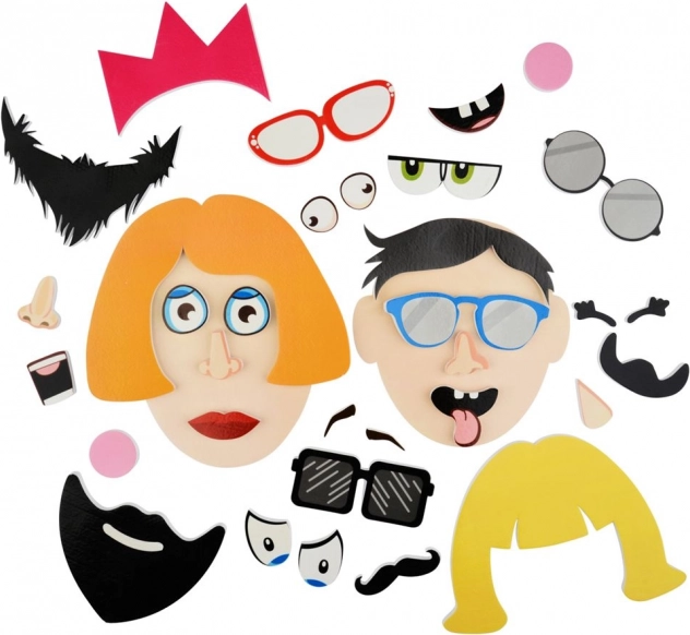 - 35 elementów – oczy, nosy, usta, włosy, okulary, korona i inne dodatki