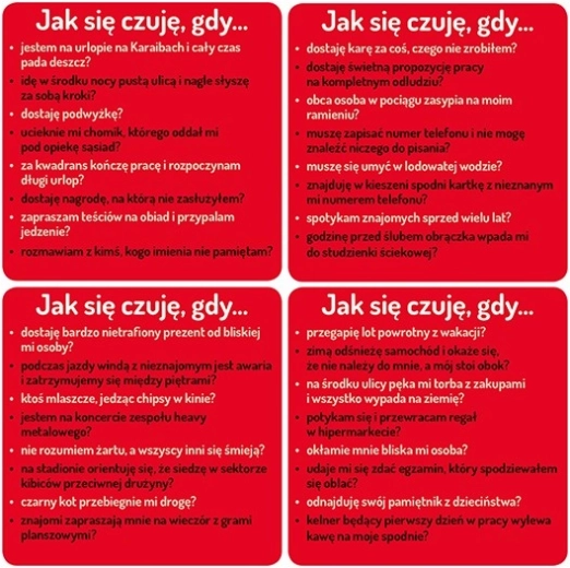 Zadaj pytanie zaczynające się od słów JAK SIĘ CZUJĘ, GDY, a pozostali gracze wyłożą po jednej karcie, która ich zdaniem najlepiej pasuje do odpowiedzi na twoje pytanie. Wybierz tę, która twoim zdaniem najlepiej oddaje twoje emocje. Gracz, który ją wyłożył, otrzymuje punkt! Wygrywa ten, kto zdobędzie 3 punkty.