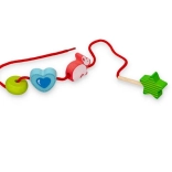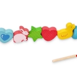 Zestaw zawiera różne drewniane koraliki o różnych kształtach i kolorach, które dzieci mogą nawlekać na tekstylną sznurówkę z drewnianymi końcówkami. To wzmacnia kreatywność i wyobraźnię dzieci.
