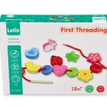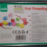 Tekstylna sznurówka z drewnianymi końcówkami do łatwego nawlekania, pomagająca rozwijać zdolności manualne.