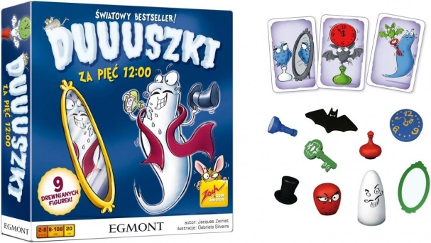 Duches dla pięciu 12:00 to najnowsza wersja imprezowego hitu. W pudełku znajdziesz 9 nowych przedmiotów i 4 warianty rozgrywki, które urozmaicają zabawę i znacząco podnoszą poziom trudności. W zależności od karty gracze chwytają przedmiot, odczytują godzinę na zegarze lub nazywają kolory przedmiotów odbijających się w lustrze. Na stole leży 9 drewnianych przedmiotów. Kto pierwszy chwyci właściwy przedmiot, wygrywa kartę. Wygrywa gracz, który na końcu gry ma najwięcej kart.