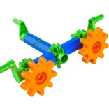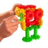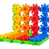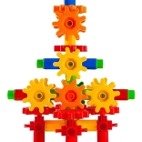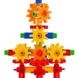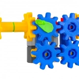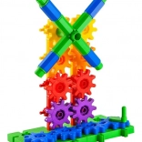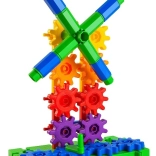 Zestaw zawiera specjalne koła zębate, które umożliwiają obrót i wprawiają konstrukcje w ruch, rozwijając umiejętności mechaniczne.