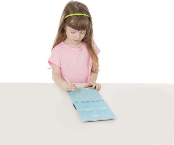 Specjalna warstwa skrywa intensywne barwy, które dzieci odsłaniają drewnianym rysikiem. Czyste tworzenie bez farb i pędzli.