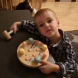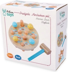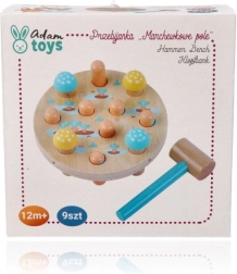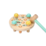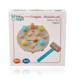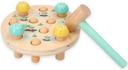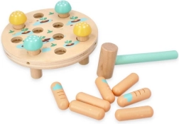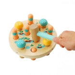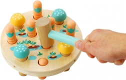 Drewniany młotek Pole Marchewkowe oferuje okrągłą drewnianą podstawę z otworami na kolorowe drewniane kołeczki w kształcie marchewek. Zadaniem dziecka jest wbicie marchewki za pomocą przyjaznego dzieciom młoteczka z miętową rączką, idealnego dla małych rączek. Szybkim uderzeniem dzieci nie tylko doskonalą koordynację oko-ręka i drobne umiejętności motoryczne, ale także zaczynają rozumieć związki przyczynowe. Po zakończeniu gry wystarczy obrócić podstawę, wyjąć marchewki i zacząć od nowa!
