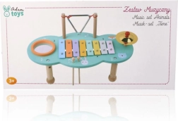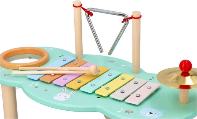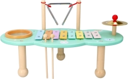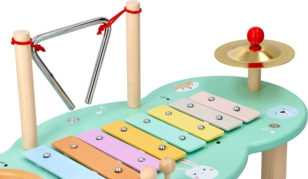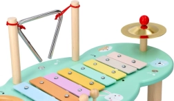 Wszystkie ulubione instrumenty perkusyjne w jednym miejscu: ksylofon, trójkąt i talerz na solidnej drewnianej konstrukcji z ilustrowanym blatem i nogami dla bezpiecznej zabawy.