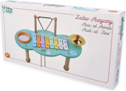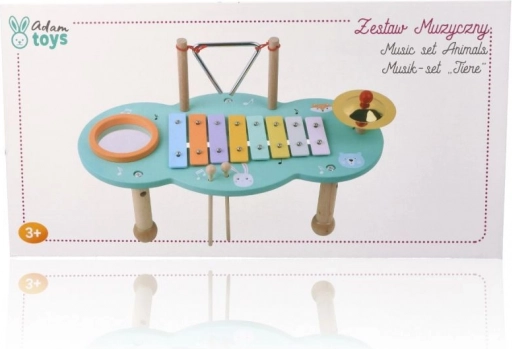 Odkryj zabawny dziecięcy stolik muzyczny, który łączy ksylofon, trójkąt i talerz w jedną kreatywną całość. Stabilna drewniana konstrukcja z uroczymi ilustracjami oraz 2 pałeczki zachęcają dzieci do odkrywania rytmu i dźwięków. Zabawa rozwija motorykę małą, koordynację i słuch muzyczny. Wymiary 43,5 × 23 × 23,5 cm, zalecane od 3 lat.