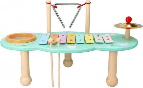 - Stolik z blatem i drewnianymi nogami, ksylofon, trójkąt, talerz, 2 pałeczki