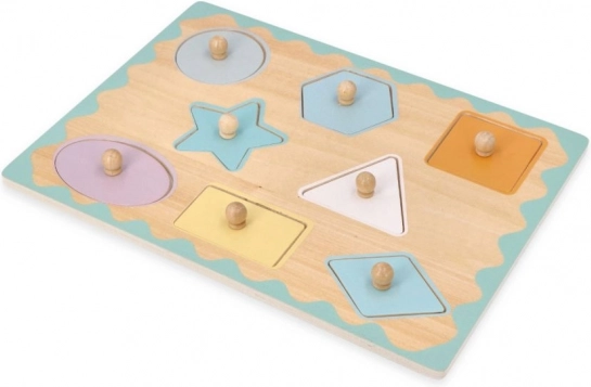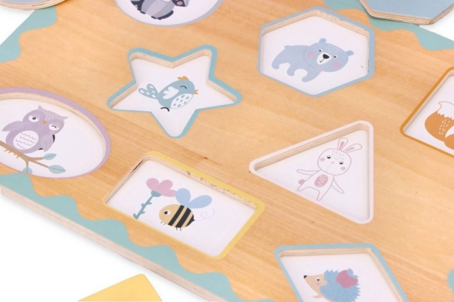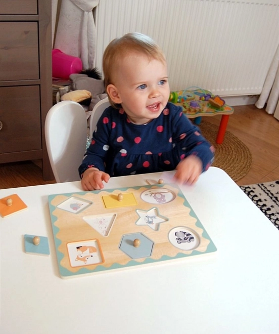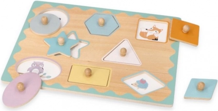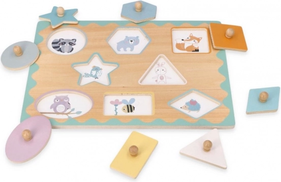 Odkryj wytrzymałą drewnianą wkładankę z uchwytami, w której każdy element ma swoje dokładne miejsce. Czytelne kształty, delikatne pastelowe kolory i sympatyczne motywy zwierzątek zachęcają do zabawy, a praktyczne uchwyty‑kołeczki ułatwiają chwytanie nawet najmłodszym.
