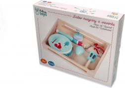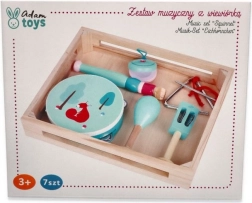 W zestawie znajdziesz tamburyn z czterema dzwoneczkami i uroczą wiewiórką, miętowy flet, marakasy z kwiatowym motywem, kastaniety z grzybkiem, dzwonki ręczne z listkiem, metalowy trójkąt z pałeczką, a wszystko to umieszczone w praktycznej drewnianej tacy/pudełku dla łatwego przechowywania i przenoszenia. Świetne do domowego muzykowania, do przedszkoli i świetlic.