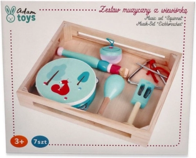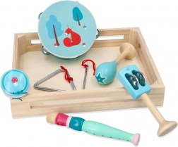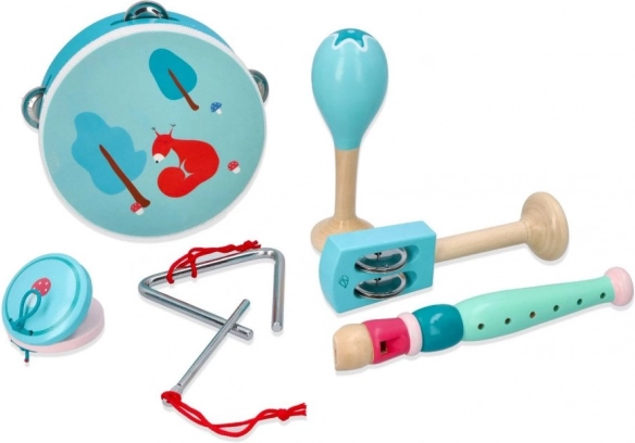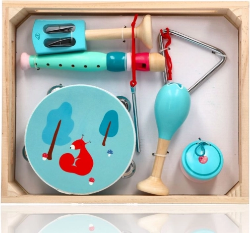 Tamburyn z motywem liska/wiewiórki, marakasy, trójkąt, harmonijka i inne instrumenty w przyjemnych miętowych barwach wspierają poczucie rytmu i koordynację rąk.