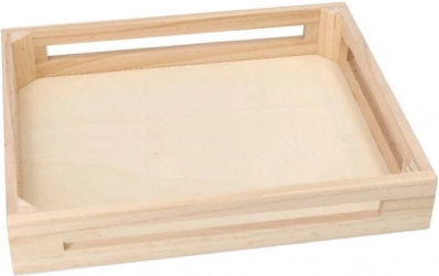 Wszystkie elementy zestawu są schludnie ułożone w drewnianej tacy z uchwytami – łatwe przenoszenie, porządek i bezpieczne przechowywanie w domu i w przedszkolu.