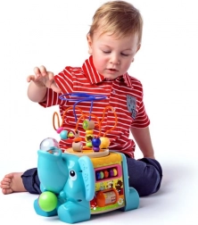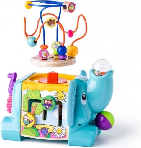 Interaktywny słoń w żywych kolorach został zaprojektowany tak, aby motywować dzieci do odkrywania. Koralikowy labirynt, obrotowe kółka, przesuwne elementy i przekładnie oferują wiele sposobów na trening palców, chwytu i logicznego myślenia. Zabawka jest stabilna, wygodna do trzymania i zachęca do wielokrotnej zabawy.