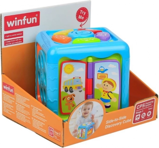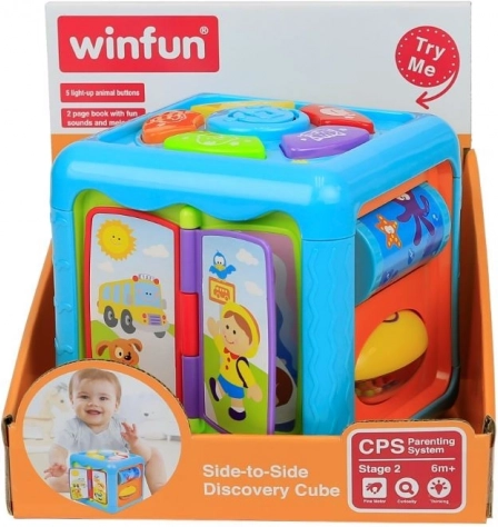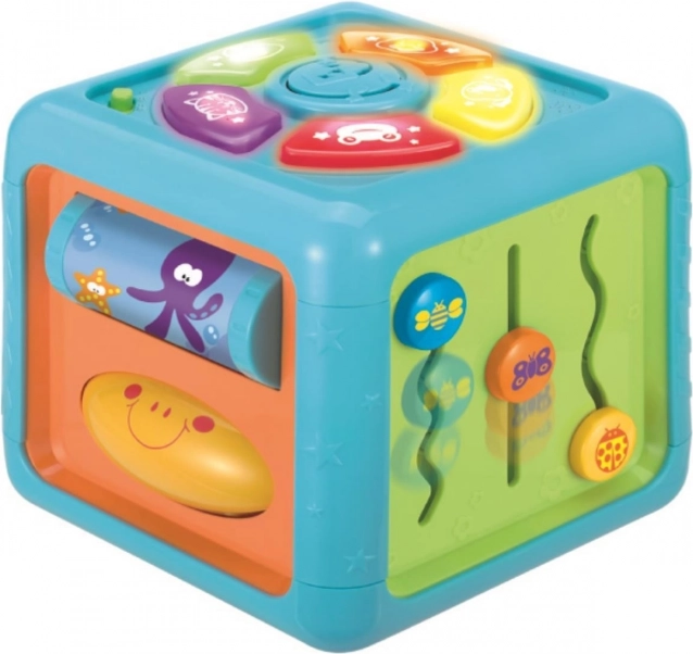 Edukacyjna kostka to wspaniała zabawa, posiada książeczkę z trzema plastikowymi kartami do przewracania, na których znajdują się zabawne historyjki. Podczas przewracania kart maluch usłyszy wesołe melodie i dźwięki. Kolorowe wałeczki – grzechotki z przyjaznymi buziami morskich zwierzątek oraz kolorowe piłeczki zainteresują każde dziecko. Maluch uczy się kolorów za pomocą obrotowego dysku. Rozwija paluszki dzięki „torowi przeszkód” dla motylka, biedronki i pszczółki.