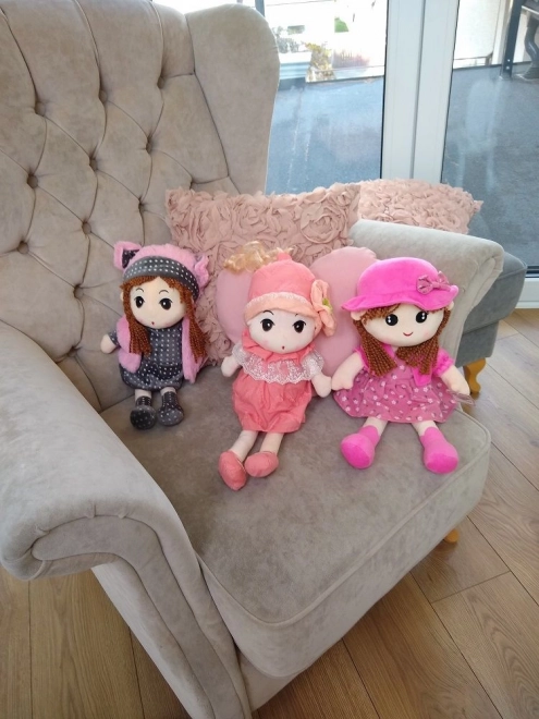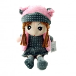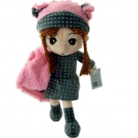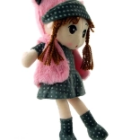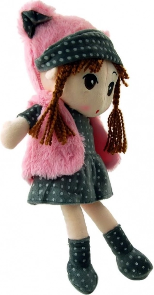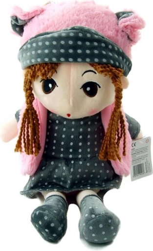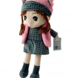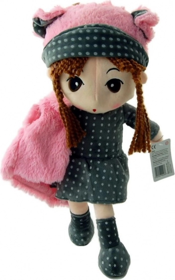 Poznaj lalkę Polę, piękną pluszową zabawkę z brązowymi splecionymi włosami, która nosi szary ubranko w groszki i różowe dodatki. Ta miękka zabawka to idealny towarzysz do codziennej zabawy oraz spokojnych nocy.