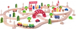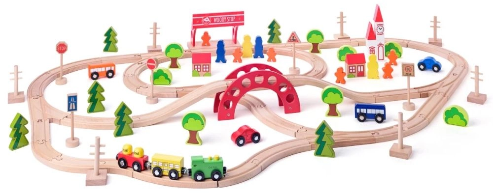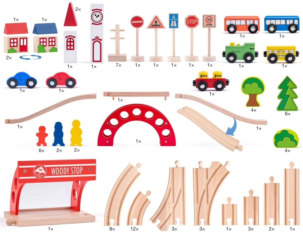 Ta drewniana kolejka jest idealna dla dzieci od trzeciego roku życia. Wspiera współpracę dzięki dużej liczbie elementów, które dzieci mogą wspólnie składać.