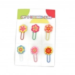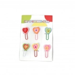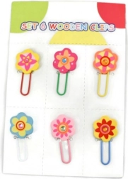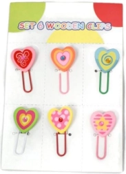 Urocze drewniane spinacze w zestawie 6 sztuk zdobione motywami serduszek lub kwiatuszków ożywią Twoje notatki, prezenty i dekoracje. Każdy spinacz ma inny kolor i pośrodku błyszczący kamyk. Idealne do dekoracji, fotokolaży, planerów oraz dziecięcych prac plastycznych.