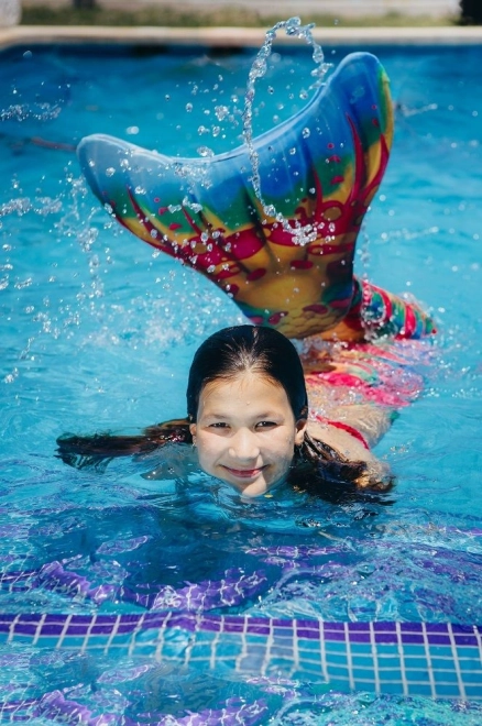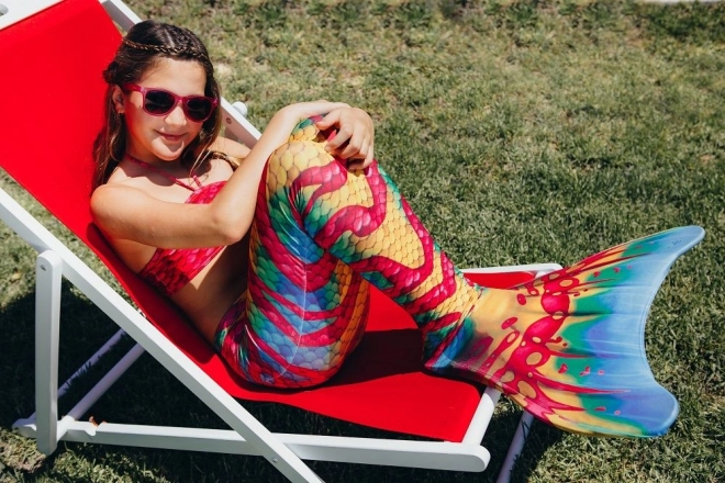 - Kolorowy ogon z realistycznym wyglądem morskich łusek w odcieniach czerwieni, żółci i niebieskiego.