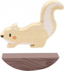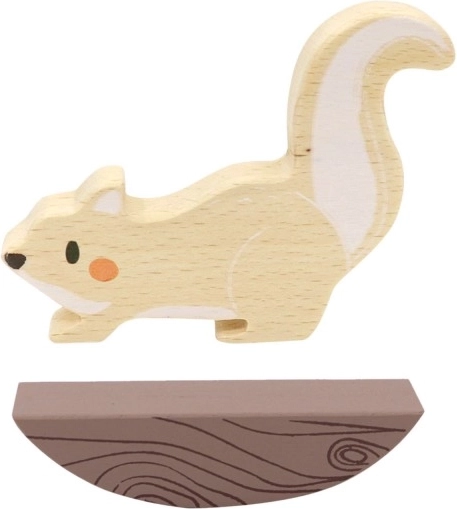 Gra wykonana jest z trwałego litego drewna z nietoksycznymi, bezpiecznymi dla zdrowia farbami i lakierami. Dzięki uniwersalnemu wzornictwu wiewiórkę i żołędzie można wykorzystać także w innych zabawach lub jako stylową dekorację do pokoju dziecięcego. Zawiera podstawkę, figurkę wiewiórki i 12 elementów do gry.