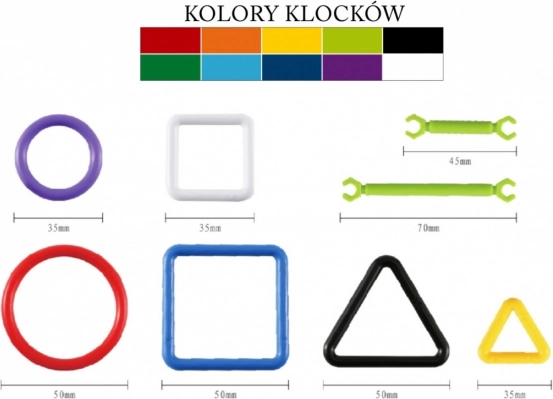 - Różne kształty – patyczki, kółka, kwadraty i trójkąty do budowy rozmaitych obiektów.