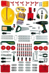 - Realistyczne wyposażenie: wkrętarka akumulatorowa, piła, młotek, klucze, szczypce, pilnik, imadło, śrubki i nakrętki.