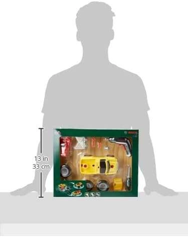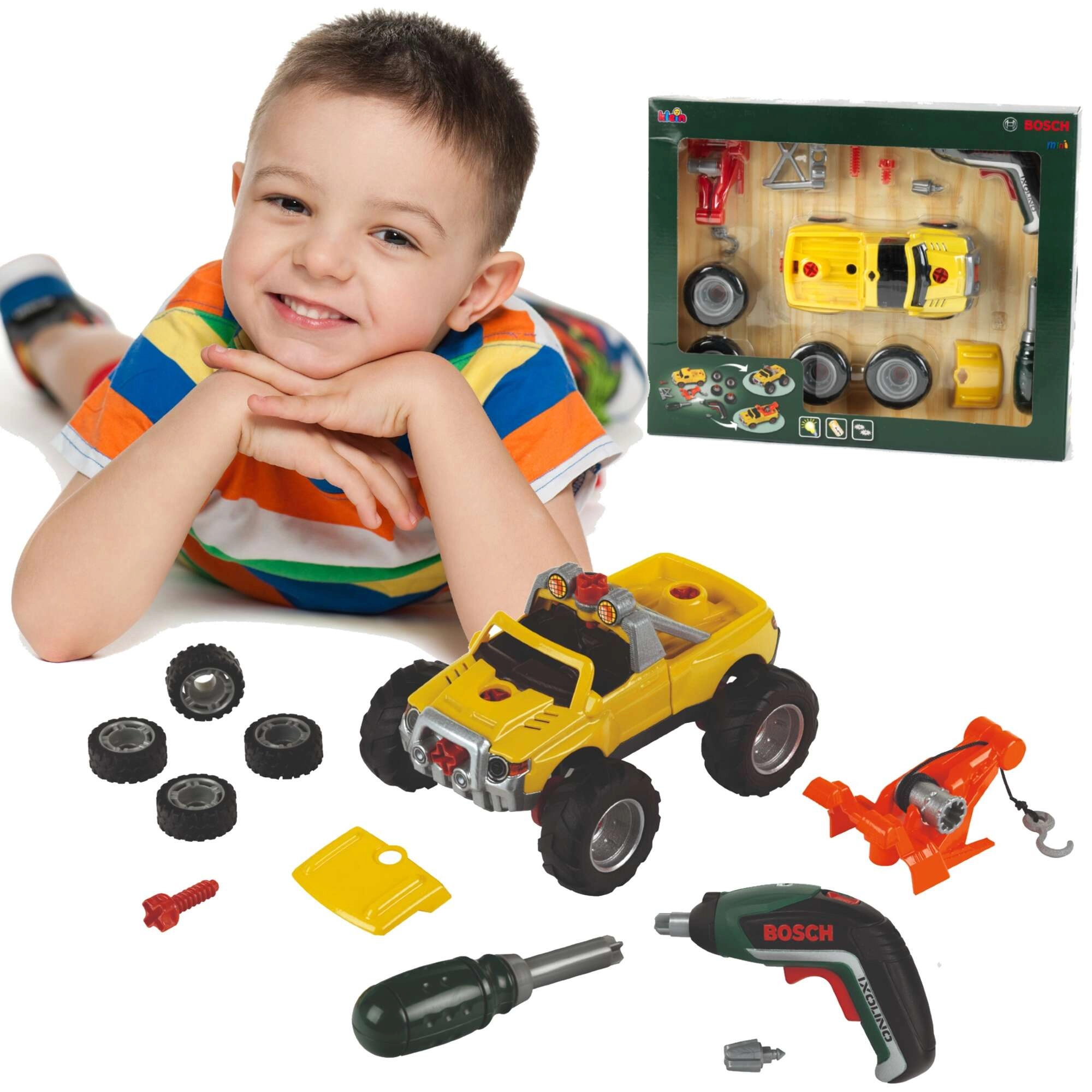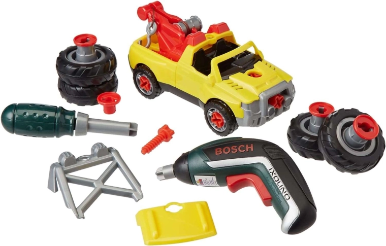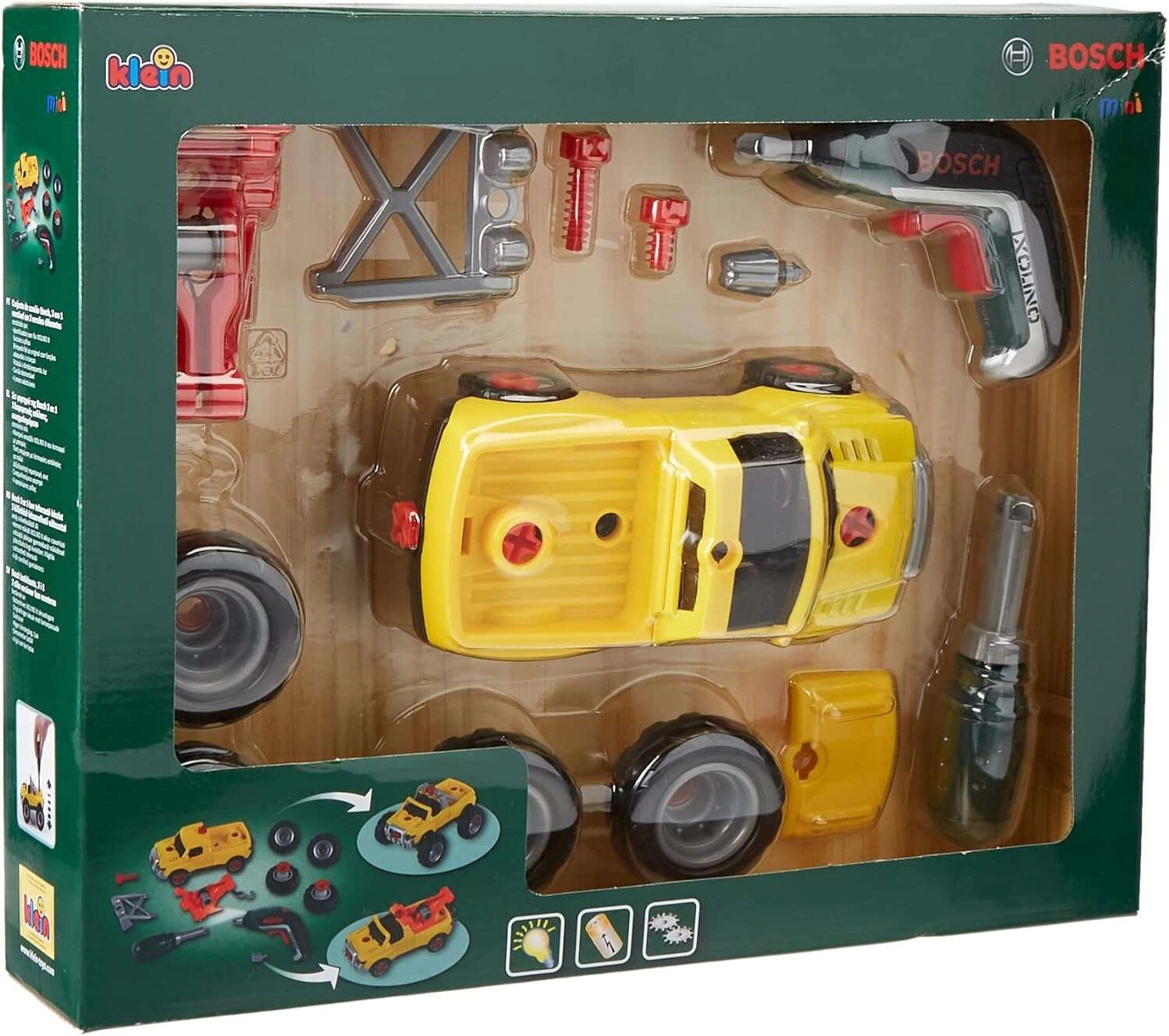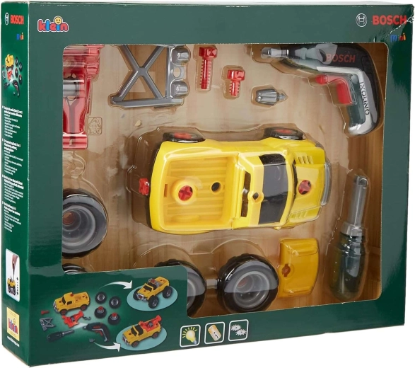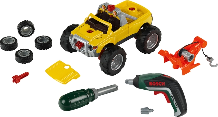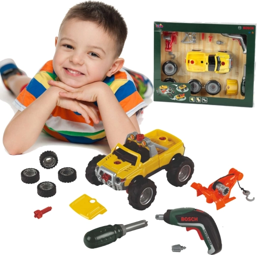 W zestawie znajduje się żółte auto do skręcania 3w1, akumulatorowa wkrętarka Bosch Ixolino II z dwukierunkowym biegiem i efektem dźwiękowym, ręczny wkrętak, wymienne bity, terenowe koła, czerwony hak holowniczy, maska oraz rama z reflektorami. Dzieci mogą przebudować pojazd na trzy warianty, dzięki czemu zabawa szybko się nie skończy.